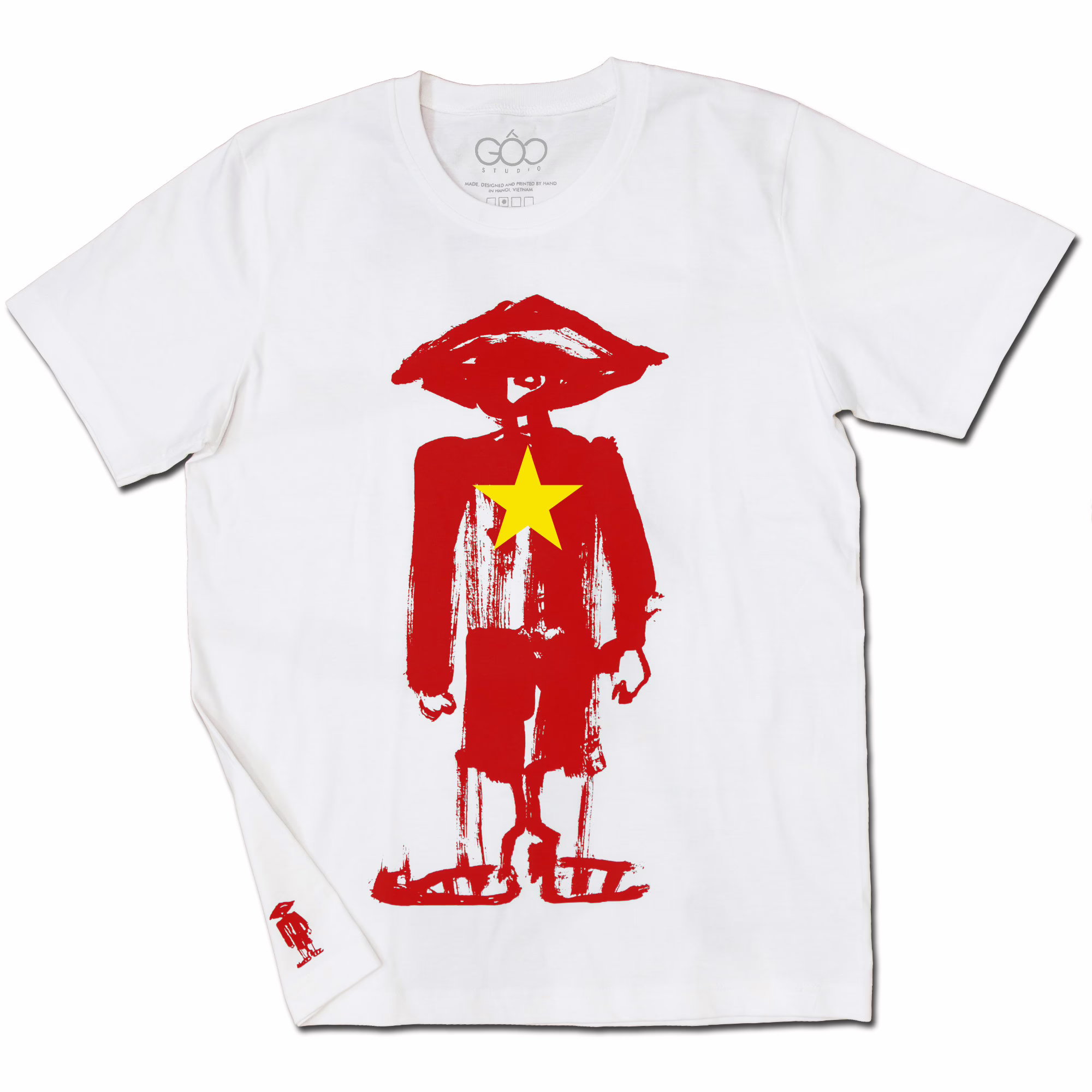 Star Rebel, red and yellow print on 100% cotton white Ultrafine t-shirt. Hand Printed at GỐC Studio, Nha Trang.